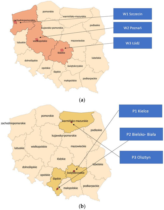 Location of the research areas within the administrative borders of Poland in the different research groups: (a) province capitals W, (b) poviat capitals P, (c) towns M, (d) rural municipalities G.