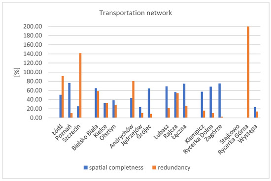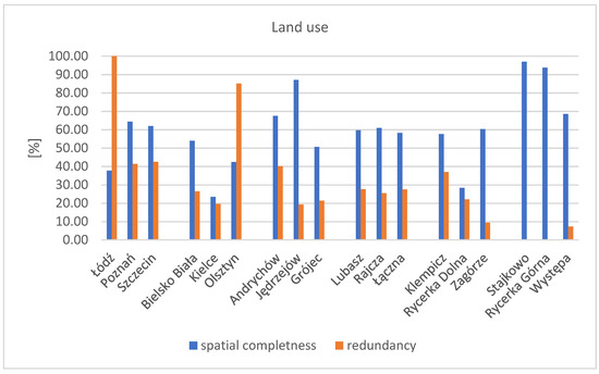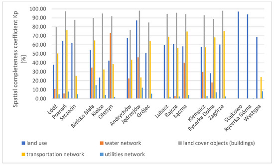 This chapter presents the results of all the analyses conducted in this study. First, Section 3.1 presents the results regarding the attribute completeness coefficient (, spatial completeness coefficient , and spatial redundancy coefficient () obtained across all 18 research areas for all research factors. Then, Section 3.2 provides detailed comparisons of the spatial completeness and spatial redundancy coefficients for the following research factors: land use, water network, land cover objects (buildings), transportation network, and infrastructure network. Section 3.3 provides the results regarding the suitability coefficient of publicly accessible geodetic databases for RES. As there are many parameters in the article, it was decided to summarise all calculated coefficients in a table. Table 15 shows all the coefficients calculated in the article with a brief explanation.
