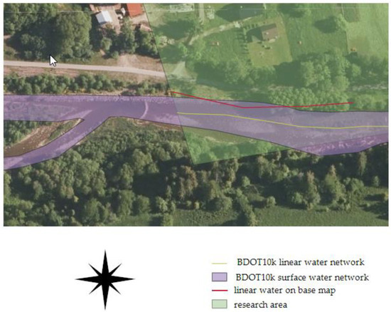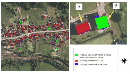 The most detailed and accurate spatial data in Poland are collected in three main geodetic databases: the land and buildings register (EGiB), the utilities network (GESUT), and the topographic objects database (BDOT500) [41,42,43]. These databases are used as reference databases for many studies and less detailed databases. Most of the objects in these databases are identified based on direct field surveying. According to the standard [44], surveying must determine a point’s location relative to the nearest horizontal geodetic control points and measurement control network with a minimum accuracy of:
