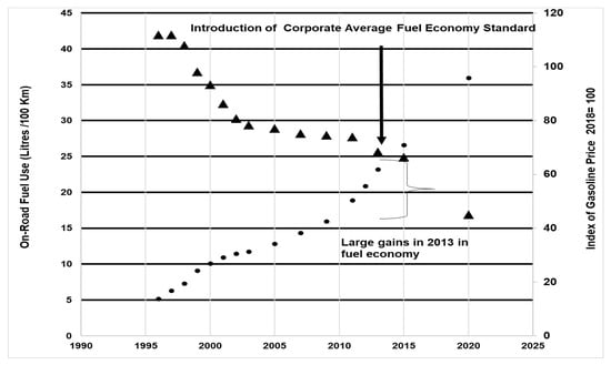 In short, fuel economy gains have reduced the consumption of fuel as a result of higher energy prices during the period 2005–2020. Energy prices (using the price index for real prices) show a three-fold increase in gasoline prices from 2000–2020 (all types of gasoline are considered in the index) (Figure 3). Monitoring changes in fuel economy gains can help to understand the trend of future fuel consumption (Figure 4). The increase in gasoline price is negatively associated with lower gasoline consumption (Figure 3 and Figure 4), but prices are insufficient to control that consumption.