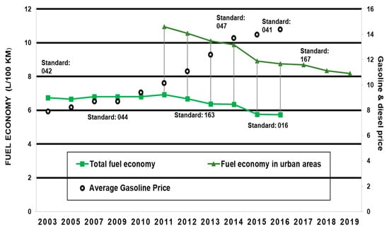 As for the procedure, the methods are based on the analysis of both [30,31], where we first calibrate levels of road fuel economy by (a) using km travelled and (b) motor fuel use, and fuel price effects on car size. Second, we correlate gasoline use to vehicle size and the adoption of fuel economy standards. The only modification is that we use historical and qualitative analysis of transport policy to explain (1) changes in fuel economy, (2) changes in vehicle emissions regulations, and (3) a case study. The evidence at hand allows a detailed analysis of three key variables: gasoline use, fuel economy of new vehicles, and on-road fuel economy. Data analysis is conducted using historical policy shifts in the key variables that help explain changes in gasoline consumption.