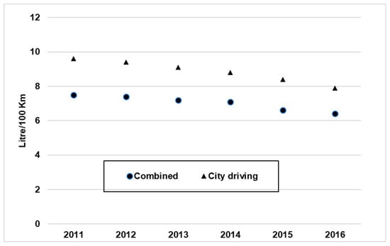 Figure 7 and Figure 8 show the development of fuel economy gains for new car fleets under city driving and combined modes. Since 2013 there has been an improvement in fuel economy gains (fewer L/100 Km) (Figure 5 and Figure 6); however, the gains in fuel economy also stem from the trend in technology improvements which occur every year.