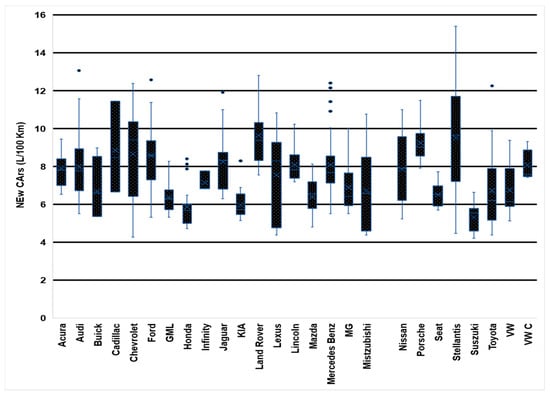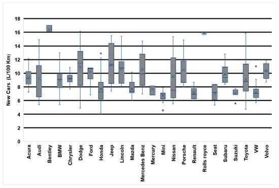Box plots of new car fuel economy by vehicle brand in 2010. Source [54].