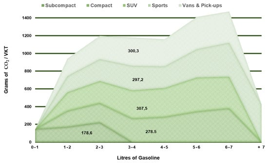 | Grams of CO2 per Vkm | Litres of gasoline by type of car | INECC (2022) [8] |