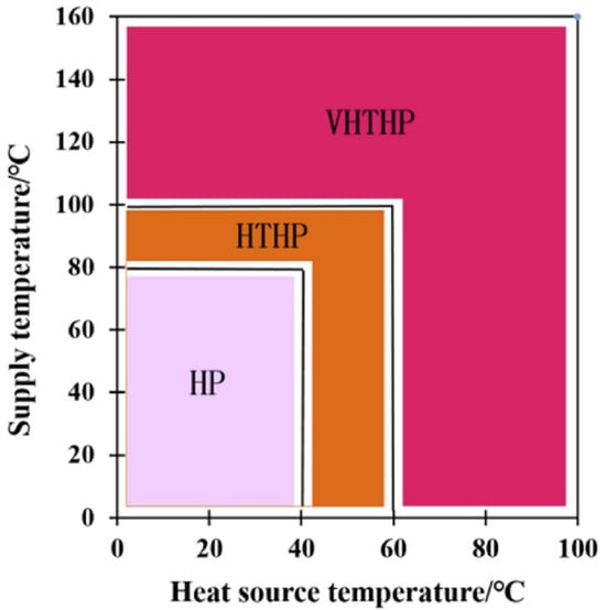 In the current literature, heat pumps are generally classified in three different groups, as shown in Figure 1: heat pumps (HP) for supply temperatures up to 80 °C; high temperature heat pumps (HTHP) from 80 °C to 100 °C; and very high temperature heat pumps (VHTHP) from 100 °C up to 160 °C (or even 200 °C) [16]. For convenience, in this paper, we will use the acronym HTHP for both HTHPs and VHTHPs.
