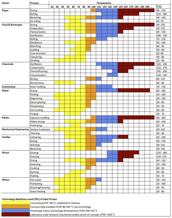 Overview of processes in different industrial sectors structured by typical supply temperature ranges and Technology Readiness Level (TRL) of heat pumps [10,17].