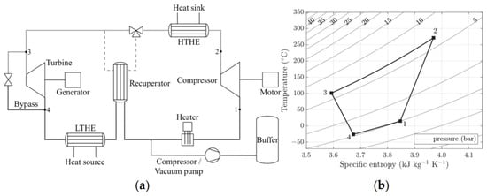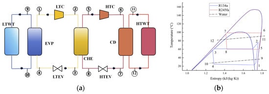(a) Schematic diagram of a CHTHP system with (b) the corresponding T-s diagram [22].