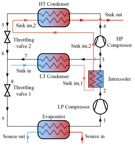 Ganesan et al. [29] present a modeling and optimization approach for a CHTHP using CO2/butane and CO2/pentane mixtures in the LS and HS cycles, respectively, for industrial high-temperature heating. The MATLAB-based model explored heating capacities up to 201.5 kW and COP improvements of 20% compared to pure fluids, showcasing the efficacy of the refrigerant mixtures. Analysis highlighted the influence of CO2 composition on heat sink temperatures and system performance, with notable impacts on COP and efficiency metrics. Navarro-Esbrí et al. [30] evaluate a two-stage CHTHP system (Figure 6), aiming to produce hot water up to 150 °C from inlet temperatures of 35 °C and 25 °C. Using experimental data from single-stage prototypes (R-1234ze(E) and R-1336mzz(Z)), a semi-empirical model assesses energy performance with novel refrigerant mixtures like R-152a/600 and R-1233zd(E)/161 for the two stages, achieving up to 14% higher COP compared to baselines. Despite a 30% increase in volumetric heat capacity (VHC), negligible direct CO2 emissions are observed due to low GWP refrigerants.