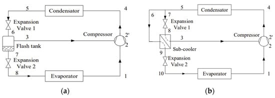 Principle diagram of the vapor injection heat pump with (a) flash tank and (b) sub-cooler [35].