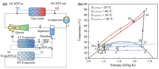 (a) Dual-temperature evaporation transcritical CO2 heat pump system C with ejector (Ej-Evap2-C). (a) Schematic. (b) T,s diagram [39].