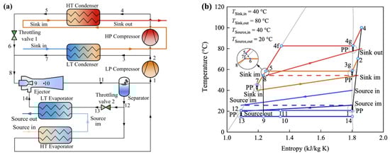 Dual-temperature condensation and dual-temperature evaporation HP 2 with an ejector (Ej-DCDE-2). (a) System diagram. (b) T-s diagram [41].