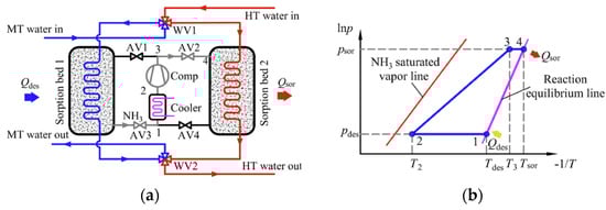 Xie et al. [46] introduce a novel ammonia-based hybrid chemisorption-compression high-temperature heat pump using SrCl2-NH3 to efficiently convert 50–80 °C waste heat into 90–120 °C high-temperature heat without requiring a costly high-pressure ammonia compressor. Figure 17 reports the scheme and the lnp-(1/T) diagram of the cycle. Key parameters like sorption pressure and reaction time are optimized, achieving a COP of 4.58 at 70 °C waste heat and 110 °C output, 14.5% higher than R245fa compression pumps.