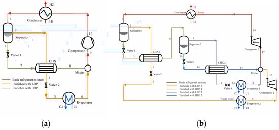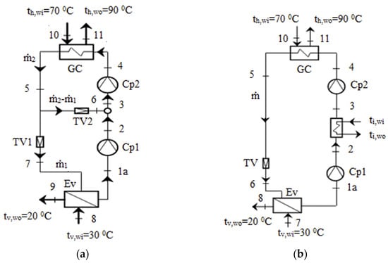Flow chart of (a) two-stage system with the injection of a cold stream between the two compression stages and (b) two-stage cycle with intermediary external cooling by preheating a stream of water [50].
