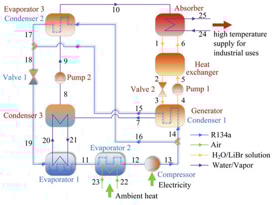 Stefanou [51] focuses on high-temperature heat pumps (HTHPs) as crucial for industrial heat decarbonization above 90 °C. Two prototypes were developed and tested: the first, integrated into a district heating loop, achieved temperatures limited by external factors, while the second, using environmentally friendly R1233zdE, operated under controlled conditions. The first prototype employed R245fa, achieving COP of 5.3–6 with heating capacity up to 43.7 kW and saving 1.44 tnCO2/yr. The second prototype achieved outlet temperatures up to 123.4 °C, with COP values ranging from 2.5 to 4.5 and efficiencies up to 85%. Economic analysis showed payback periods from 2.3 to 3.4 years, highlighting significant CO2 emissions savings, up to 85%, compared to gas boilers. Gao et al. [52] proposed a novel air-source hybrid absorption-compression heat pump for stepped temperature lifts. The scheme is reported in Figure 20. It achieves a large temperature lift (over 90 °C) and thermodynamic perfectibility (0.34). The coefficient of performance (COP) changes from 1.7 to 1.2 as temperature lifts from 70 °C to 110 °C. Internal heat recovery reduces heat exchanger area and cost. This system offers a feasible and efficient method for upgrading ambient heat for industrial uses.