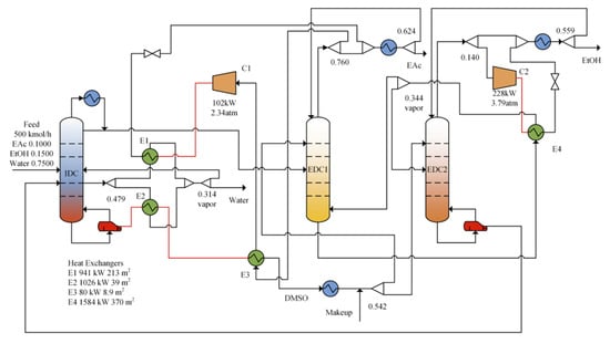 Separating ternary azeotropes with a high content of one component using extractive distillation is energy-intensive, but preconcentration can enhance process economy. Wu et al. [57] optimize three processes for recovering ethyl acetate (EAc) and ethanol (EtOH) from wastewater: the conventional three-column extractive distillation (TCED), four-column extractive distillation (FCED) with preconcentration, and three-column extractive distillation with integrated distillation column (TCED-IDC), focusing on minimizing total annual cost (TAC). The IDC integrates preconcentration and solvent recovery. A vapor recompression heat pump (VRHP) is introduced to the TCED-IDC process to reduce energy consumption, leading to two VRHP-TCED-IDC process designs. These processes are evaluated on economy, energy consumption, environment, and exergy destruction (4E analysis). The VRHP-TCED-IDC processes excel in 4E analysis. The most efficient VRHP-TCED-IDC process (the scheme is shown in Figure 22) reduces TAC by over 32.0%, energy consumption by 53.4%, GWP by 62.0%, and exergy destruction by 49.7% compared to TCED, with significant improvements over FCED and TCED-IDC as well.