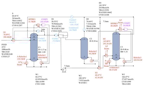Wang et al. [58] analyze the thermo-economic benefits of vapor recompression in an ethane-ethylene distillation process. Initial simulations of the current process align closely with real plant data, showing high refrigerant consumption. The proposed vapor recompression method reduces the investment cost by 5.72% and cuts refrigerant use by 34.29%. Exergy analysis shows significant improvements, with reduced losses in the reboiler and condenser. Li et al. [59] explore separating cyclohexane/tert-butanol from industrial effluent using heterogeneous pressure-swing azeotropic distillation. Optimal parameters for the conventional process are determined using the simulated annealing algorithm. Heat pump and heat integration strategies are incorporated to enhance energy efficiency. The heat pump-assisted process with auxiliary reboilers and heat integration (HADPSD-ARHI) achieves significant reductions: 41.98% in total annual cost (TAC), 55.32% in total energy consumption (TEC), 52.30% in gas emissions, and 55.26% in exergy destruction, compared to the conventional process. The flowsheet of HADPSD-ARHI is shown in Figure 23.