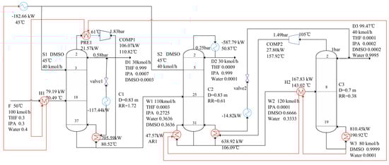 The same research group in [63] introduces two energy-efficient extractive distillation processes for separating acetonitrile/1,4-dioxane/water mixtures. Heat pumps and heat integration enhance energy conservation in both processes. The heat pump-assisted direct extractive distillation achieves a 53.58% energy reduction, and 53.56% CO2 emission reduction compared to the indirect scheme, while direct distillation with heat integration reduces total annual cost by 40.38%. The direct extractive distillation with heat integration (DED-HI) process excels in economic and exergetic aspects, while the heat pump-assisted DED process (DED-VR) demonstrates superior energetic and environmental benefits among the proposed designs. Zhu et al. [64] focus on the extractive distillation of the cyclohexane/sec-butyl alcohol/water azeotropic mixture, critical in environmental risk mitigation and solvent recycling. Using the COSMO-SAC model, solvents were screened based on relative volatility and solvent power, with ethylene glycol (EG) chosen for its lower boiling point. Optimizing the extractive distillation process with a sequential iterative algorithm and incorporating energy-saving methods like thermal coupling and heat pumps led to significant improvements. The best configuration (HPCWTCED, heat pump combined with thermal coupling extractive distillation), the scheme for which is shown in Figure 26, increased thermodynamic efficiency by 73.89%, reduced total annual cost by 25.62%, and decreased CO2 emissions by 81.08%, supporting sustainable development in the chemical industry.