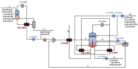 Zhai et al. [67] present a new extractive-azeotropic dividing wall column (EADWC) configuration for recovering acetonitrile from wastewater, replacing the conventional two-column process. The proposed design significantly improves energy efficiency by incorporating vapor recompression heat pumps and heat exchanger networks (HPEADWC-FP-HI, Figure 28). Evaluation of the HPEADWC-FP-HI shows substantial reductions in total annual cost (up to 51.95%), CO2 emissions (89.96%), and total energy consumption (63.58%) compared to the conventional process. The enhanced design is also inherently safer. Despite a 65% increase in total capital cost, the payback period is 3 years with a 30.46% reduction in total annual cost. A similar approach is applied by Zhai et al. [68] for the separation of the acetone/n-heptane mixture, which forms a minimum-boiling azeotrope. Four energy-efficient extractive dividing wall column (EDWC) designs incorporating feed preheating, heat pump (HP), and heat exchanger network (HEN) are analyzed to improve sustainability. The best configuration (HPEADWC-FP-HI) achieves a 38% reduction in energy consumption, 20% in total annual cost (TAC), and 41% in CO2 emissions compared to conventional methods.
