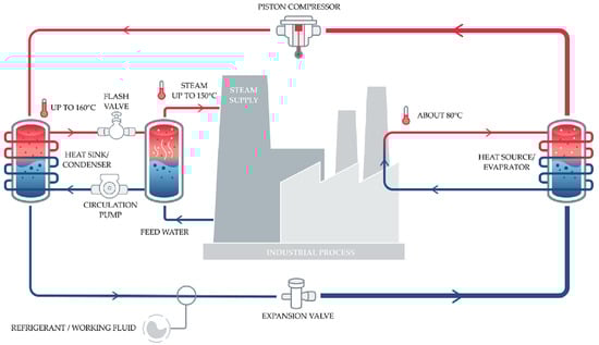 Current research on vapor compression HTHPs focuses on both subcritical and transcritical cycles, but absorption cycles also offer interesting opportunities that are being studied. In any case, to optimize the efficiency of the heat pump, a careful choice of its most appropriate configuration is needed (e.g., standard cycle, use of internal exchanger, economizer, intercooling, parallel compression, multistage compression, cascade cycle, etc.) in relation to the type of application and boundary conditions, with particular reference to the heat sink temperature and the temperature lift between source and sink. The integration of HTHPs with renewable energy sources and waste heat recovery systems can further improve their efficiency and sustainability. Furthermore, HTHPs can increase the flexibility of energy networks by acting as electricity demand response tools to support the integration of intermittent renewable energy sources.