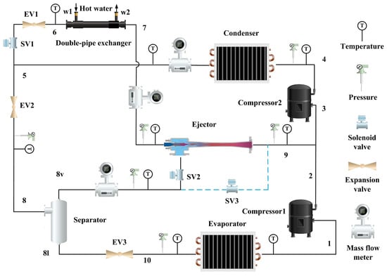 - Jing, S.; Chen, Q.; Zhou, Y.; Yu, J. Thermodynamic analysis of a modified booster-assisted ejector heat pump cycle with dual condensers. Appl. Therm. Eng. 2023, 235, 121351. [Google Scholar] [CrossRef]