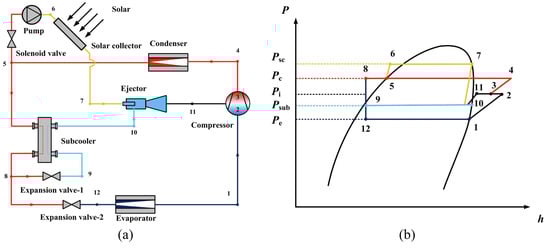 - Yu, M.; Yu, J. Thermodynamic analyses of a solar assisted ejector enhanced vapor injection cycle with subcooler for heat pump dryer application. Sol. Energy 2022, 232, 376–387. [Google Scholar] [CrossRef]