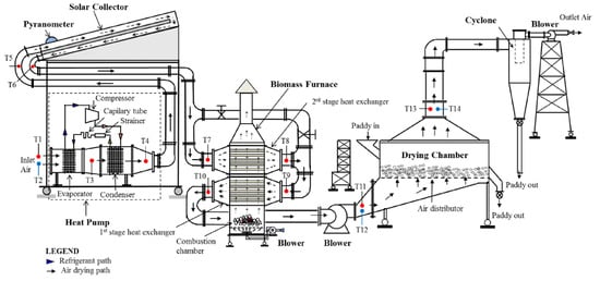 - Yahya, M.; Rachman, A.; Hasibuan, R. Performance analysis of solar-biomass hybrid heat pump batch-type horizontal fluidized bed dryer using multi-stage heat exchanger for paddy drying. Energy 2022, 254, 124294. [Google Scholar] [CrossRef]
