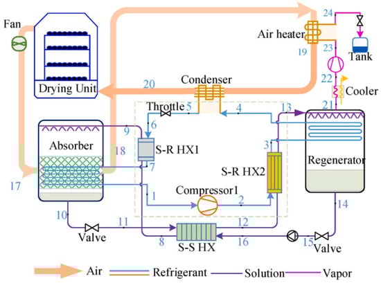 - Su, W.; Ma, D.; Lu, Z.; Jiang, W.; Wang, F.; Xiaosong, Z. A novel absorption-based enclosed heat pump dryer with combining liquid desiccant dehumidification and mechanical vapor recompression: Case study and performance evaluation. Case Stud. Therm. Eng. 2022, 35, 102091. [Google Scholar] [CrossRef]