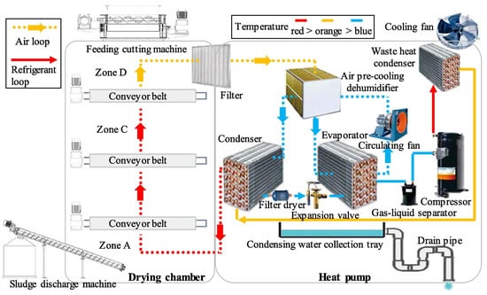 - Zheng, Q.; Cao, L.; Ni, L.; Huang, G. Operating characteristics of sludge heat pump dryer and influencing factors of performance: A field experiment in an electroplating factory. Appl. Therm. Eng. 2022, 212, 118602. [Google Scholar] [CrossRef]