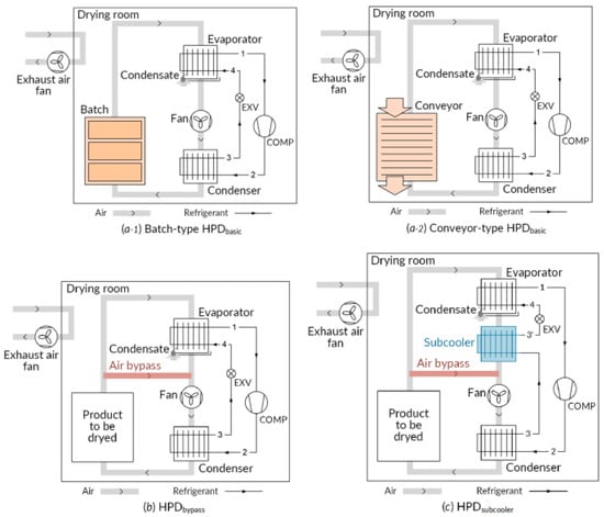 - Cheng, J.H.; Yu, W.; Cao, X.; Shao, L.L.; Zhang, C.L. Evaluation of heat pump dryers from the perspective of energy efficiency and operational robustness. Appl. Therm. Eng. 2022, 215, 118995. [Google Scholar] [CrossRef]