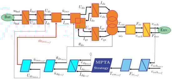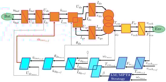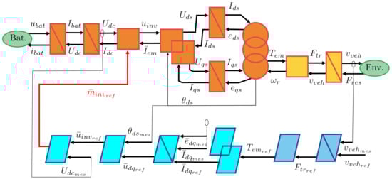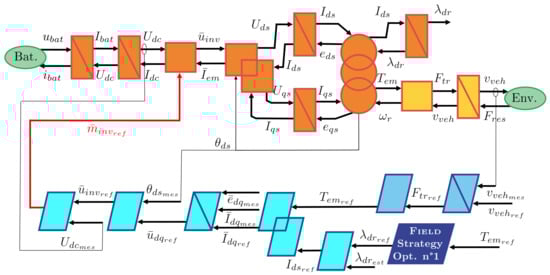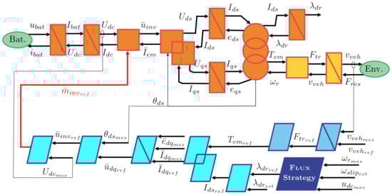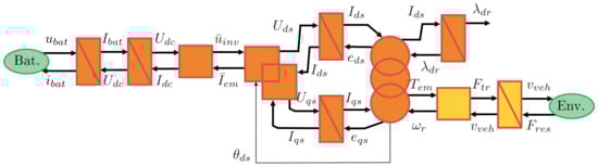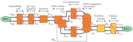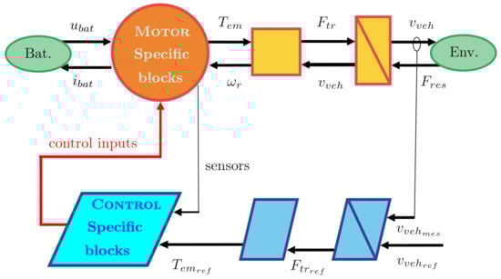 In order to organize the model and the control of the car, the Energetic Macroscopic Representation (EMR) [] is used. This is a graphical method that enables the breaking down of the system model into control-oriented components, facilitating the systematic derivation of control schemes. The EMR serves as a roadmap for simplifying the model to create a straightforward vehicle simulation. EMR is used for modeling electrical vehicles [,], subway [], fuel cell [], wind energy conversion systems []. In this paper, several motors and control laws will be evaluated. Then, a generic scheme of the dynamical model and the control process is presented in Figure 1. The orange or yellow blocks represent the plant, i.e., the motor, the batteries, and the environment of the car. The blue blocks stand for the controller (one-speed controller and the specific control block for different motors). All the need blocks in the EMR formalism are presented in detail in the next sections. The parameters and variables of the vehicle are described in Table 1.