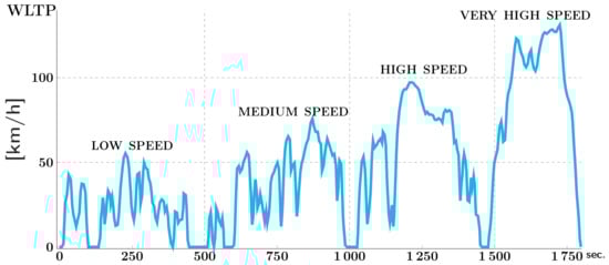 The driving cycle WLTP or “Worldwide harmonized Light vehicles Test Procedure” is the new European standard for vehicle testing [,]. This cycle is depicted in Figure 2. Since 2018, all new vehicles leaving the factory run through this simulator in order to measure the fuel consumption, exhaust emissions of combustion models, and measure the range of electric vehicles. The cycle has a duration of 1800 s or 30 min and comprises four phases. The first two phases represent an urban cycle, while the last two are extra-urban, with a maximum speed of 131 km/h. The accelerations and decelerations are designed to best represent human behavior.