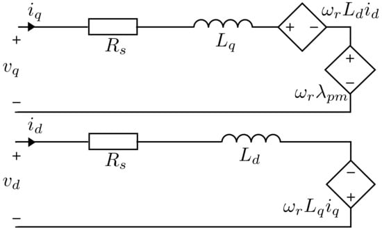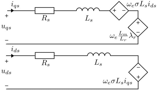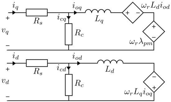By slightly modifying Figure 4, a model closer to reality can be obtained []. Figure 7 adds a resistor representing iron losses within the motor. The currents and will now be divided into two parts: the currents producing the torque; and the currents producing the iron losses.