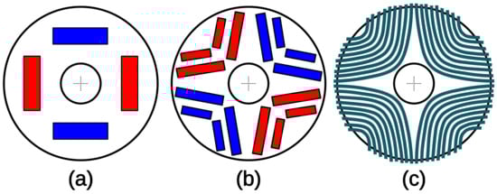 Reluctance appears in the IPMSM because its magnets are integrated into the rotor and can be arranged in a different way []. For example, Toyota uses a V-shaped arrangement in its hybrid vehicles. The skewed exposure of the permanent magnets will create a difference between the inductances and . This difference is used to create a reluctant torque. The IPMSM will be characterized by its salience ratio (/). The higher this ratio, the greater the torque density. Several techniques exist to increase this ratio: for example, multiplying magnet layers (Figure 6b) or axial laminations (Figure 6c).