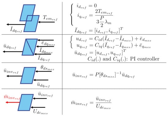 Blocks specific to the IPMSM have been added to the common blocks of Figure 1. These blocks are defined by the following model equations: