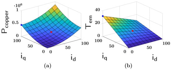 The copper losses in Equation (14) are due to the Joule effect caused by the heating of the winding wires. The coefficient comes from the formula in three phases with the stator resistance in view of the star configuration.