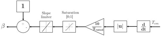 On the other axis, the current ensures that torque demand is met by returning the torque in Equation (30).The aim is for the torque of the asynchronous motor to depend on a single current, as in a DC motor. This equation is detailed and linked to the blocks on Figure 21.