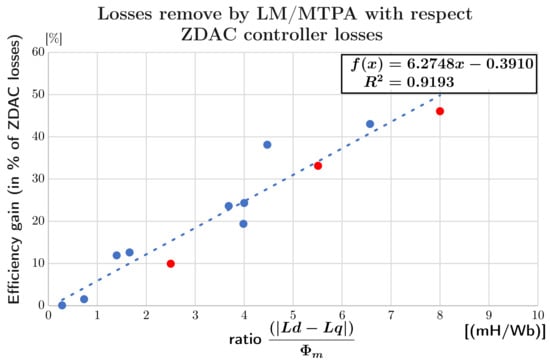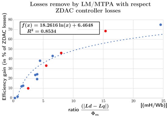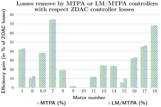 For the PMSM, the LM/MTPA control was the most effective in considering copper and iron losses. Its implementation over ten motors demonstrated its effectiveness with an average of 25% of losses eliminated and an average efficiency increase of 3.2%. However, it should be noted that the benefits of this control depend heavily on the motor parameters on which the control is implemented. Hence, the eliminated losses were expressed as a ratio between the main torque and the reluctance torque to predict the performance of any IPMSM control.
