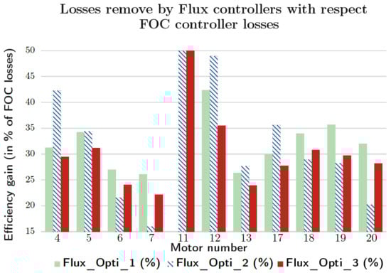 Figure 27 is used to compare gains with losses in relation to the FOC control. The control performs better on motors with lower power ratings (MAS4, MAS12, and MAS17). Whereas the control stands out on more powerful motors (MAS6, MAS7, MAS18, MAS19, and MAS20). As for the control, it is more constant regardless of motor power. We can conclude that, whatever the control chosen, the losses suppressed are quite significant compared with the FOC control, but depending on motor power, one of the three flux-optimized controls will perform better.