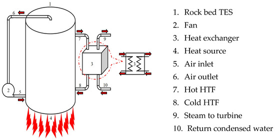 Schematic diagram of power generation system with directly heated rock bed TES.