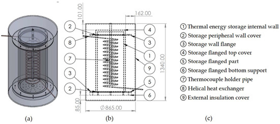 Representations in 2D and 3D of the TES experimental model, showing the overall dimensions and key components: (a) 3D view, (b) main dimensions, and (c) component labels.