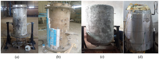 Thermal energy storage (TES) constructed with different insulation materials: (a) TES without insulation, (b) TES with refractory insulation, (c) TES with castable insulation over refractory, (d) TES with fiberglass insulation over castable insulation.