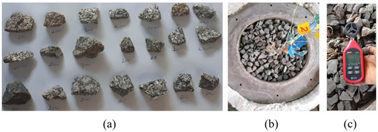 Experimental setup: (a) crushed granite rock sizes, (b) rock bed with embedded thermocouples, (c) fluid velocity measurement point at the TES top.