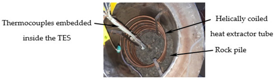 The experimental setup for the thermal energy storage (TES) is comprehensively illustrated through a series of figures. Figure 2 presents both 2D and 3D drawings of the TES geometric model, highlighting the overall dimensions and key components. Figure 3 showcases the TES constructed with various insulation materials, including configurations before insulation, with refractory insulation, with castable insulation over the refractory, and with fiberglass insulation over the castable insulation. Figure 4 details the experimental setup, showing the crushed granite rock sizes, the rock bed embedded with thermocouples, and the fluid velocity measurement point at the top of the TES. Figure 5 features the helical copper tubes used for circulating the heat transfer fluid (HTF) within the system. The different configurations of the experimental setup are further depicted in Figure 6, which focuses on natural convection, and Figure 7, which provides a pictorial illustration of the TES setup under forced convection conditions.