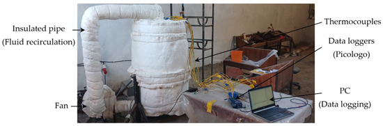 During the charging process, a digital temperature controller, programmed with Arduino and integrated with a contactor and thermocouple, was used to maintain a constant average temperature input for the TES. Forced convection was achieved using a centrifugal fan connected to a chain and sprocket mechanism driven by a motor, as shown in Figure 8. Flow rates of 0.044, 0.032, and 0.016 kg/s were calculated in the porous medium, corresponding to measured flow velocities of 1.1 m/s, 0.8 m/s, and 0.4 m/s, respectively, at the top of the storage for different fan configurations. These flow rates were determined at the average temperature of the TES, with a porosity of 0.4. Insulated air ports (9 cm diameter pipes) were used for fluid recirculation, as illustrated in Figure 7.