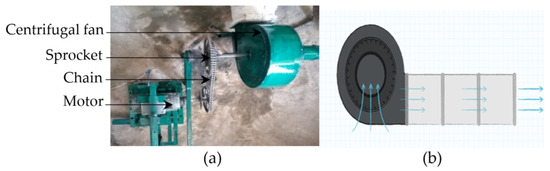 Centrifugal fan used in the experimental study: (a) actual fan (without insulation), (b) flow representation.