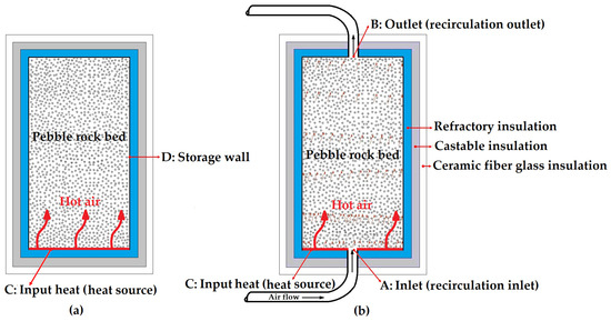 Simplified schematic diagram of the thermal energy storage showing the boundary conditions (A–D) and the insulations. (a) Natural convection. (b) Forced convection.