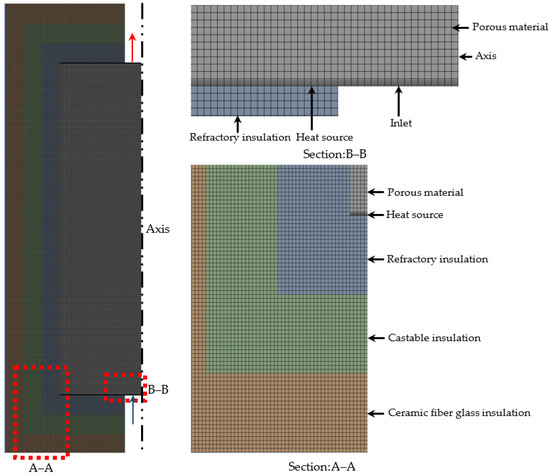 Figure 12 presents the axisymmetric 2D TES model mesh, highlighting the porous material, heat source, inlet, and insulation. A 2.5 mm mesh size was applied, with a finer mesh (inflation) at the heat source, inlet, and outlet (section B–B) to ensure accurate results. Conformality was maintained across the various connections within the TES model (section A–A).