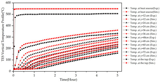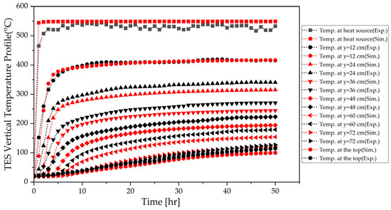 Figure 13 shows the temperature measurements at various positions inside the TES during the natural convection process, offering insight into the thermal distribution evolution across the system. Initially, both the simulation and experiment show rapid temperature increments. This rapid initial temperature increase during charging was caused by buoyancy-driven natural convective heat transfer due to high temperature gradients. After about 10 h, the system approaches steady-state conditions, and the temperature increment slows down. The decrease in temperature increment indicates a shift towards conduction-dominated heat transfer, limited by the inherently low thermal conductivity of rock, within the TES. This indicates that the TES achieved thermal equilibrium with thermal losses balancing the source and the system characterized by a constant internal temperature at different positions inside the TES. In both the experiment and simulation, a maximum temperature of 400 °C was observed after 10 h at the 12 cm vertical position from the heat source. From the TES vertical temperature profile at the end of the charging period, errors of 0.30%, 7.43%, 9.65%, 12.91%, 13.90%, 4.91%, and 12.95% were obtained at vertical positions of 12 cm, 24 cm, 36 cm, 48 cm, 60 cm, 72 cm, and the top, respectively, when comparing the experimental and simulation results. These differences may be attributed to the following factors: (a) The simulation assumes uniform porosity, whereas in the experiment, porosity is likely non-uniform. (b) The estimated heat loss in the simulation might be overestimated. Despite these discrepancies, the overall temperature trends in both the experiment and simulation show good agreement, indicating that the simulation model is reasonably validated by the experimental results.