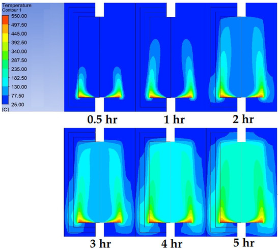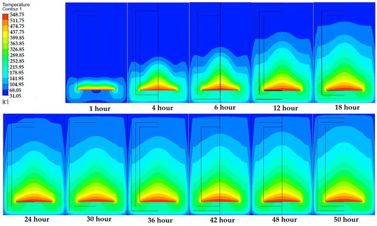 Figure 15 shows the simulation results as a temperature contour within the TES. It shows the results of the axisymmetric model mirrored along the center axis, providing a full overview of the TES (all the proceeding contour plots are shown as such). The temperature distribution showed a significant increase in the first few hours, followed by a gradual increase. Simulating the TES charging process for an extended period using the natural convection method in this study revealed a limited increase in internal temperature, suggesting the method’s inefficiency in reaching an average temperature of 220 °C after 50 h of charging. Hence, it seems that employing natural convection heat transfer is not a practical choice for this specific application.