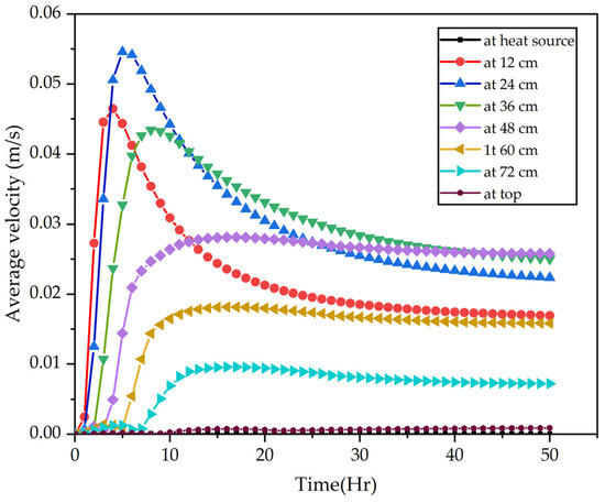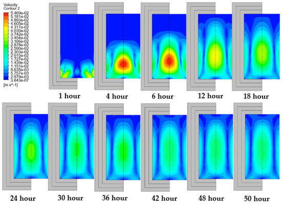 In the simulation study, airflow velocity within the storage was recorded to evaluate the effect of natural convection heat transfer. Figure 16 illustrates the flow velocity at various positions during the process, showing a peak in the first 10 h of heating, followed by a constant value, indicating the approach of stagnation temperature (as can be seen in Figure 13). Figure 17 presents the velocity contour of the TES, which reveals higher flow velocity at the center and near the walls, suggesting relatively higher temperatures at the center and increased heat loss at the walls (as shown in Figure 15).